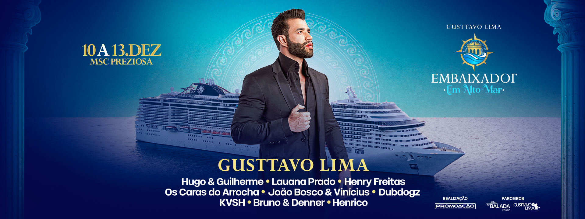 Prepare-se para viver uma experiência que vai muito além dos palcos! O Navio do Gusttavo Lima – Embaixador em Alto-Mar reúne o melhor da música sertaneja, luxo e diversão em uma viagem inesquecível a bordo do MSC Preziosa. O anfitrião da festa, Gusttavo Lima, promete momentos intensos, com grandes shows, festas temáticas e uma energia que só o Embaixador sabe transmitir.