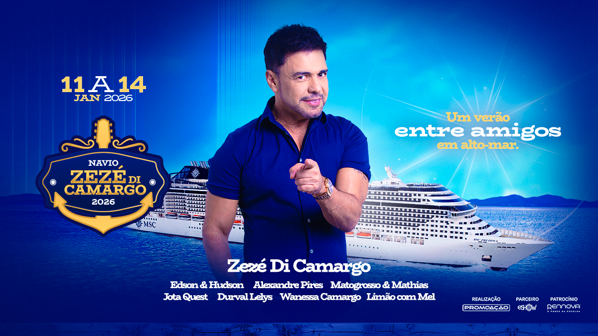 O Navio do Zezé Di Camargo está de volta e promete uma edição ainda mais emocionante em 2026! De 11 a 14 de janeiro, o luxuoso MSC Preziosa será palco de uma verdadeira celebração da música, da amizade e dos bons momentos. Serão quatro dias de festa, encontros e muita emoção ao lado de um dos maiores nomes do sertanejo brasileiro.